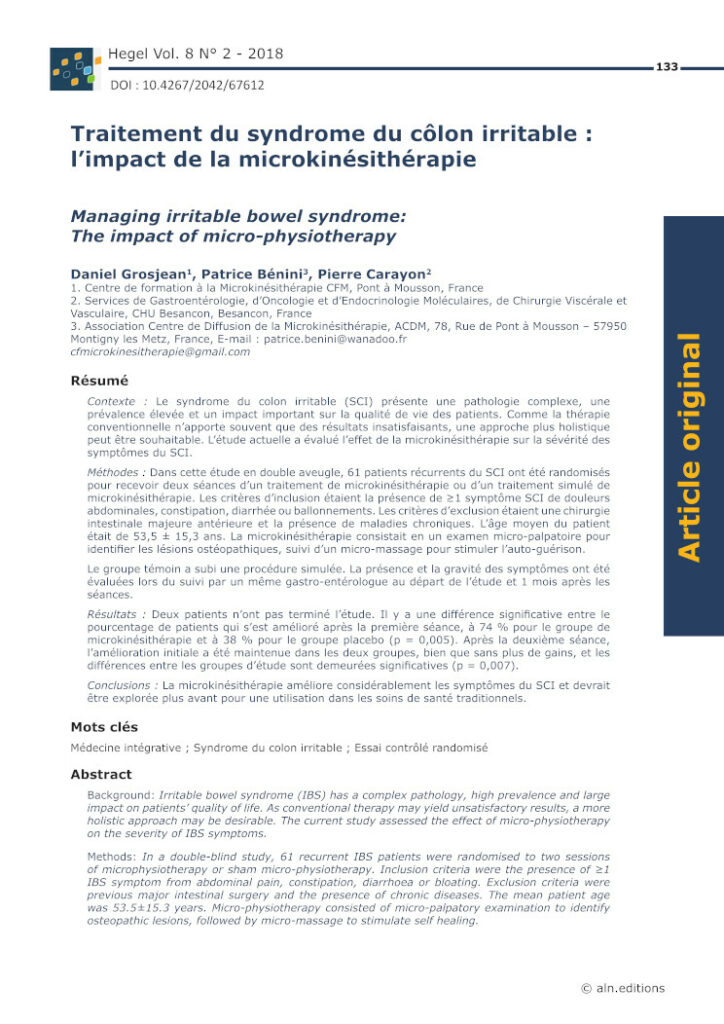 Une description de l’article Managing irritable bowel syndrome: The impact of micro-physiotherapy Grosjean D., Benini P., Carayon P, “Managing irritable bowel syndrome: The impact of micro-physiotherapy”, J Complement Integr Med. 2017 Mar 16;14(2). pii: /j/jcim.2017.14.issue-2/jcim-2015-0044/jcim-2015-0044.xml. doi: 10.1515/jcim-2015-0044″